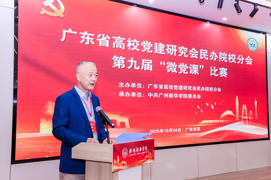 广东省高校党建研究会民办院校分会会长、广东白云学院党委书记孙国忠在致辞中,对顺利通过本科教学工作合格评估并迎来二十周年校庆的广州新华学院表示祝贺,并向全体与会人员致以问候与感谢。孙国忠强调,广东省民办高校近年来坚持以习近平新时代中国特色社会主义思想为指导,探索党建工作与教育深度融合新路径,成效显著。他指出,微党课虽“微”,却能以小见大,是传递党的创新理论、激发党员奋进力量的有效载体。他对参赛选手提出三点希望:要聚焦主题,讲好党的故事;要创新形式,提升党课感染力;要加强交流,共同进步,并预祝比赛取得圆满成功。